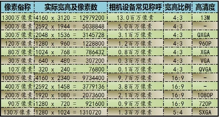 在使用手机的照相机设备或者数码相机设备时,一般自己是可以调整照片成像分辨率及比例的,我们一般采用上述标准去描述我们的分辨率,最近常常灌入耳中的720P、960P、1080P等分辨率都已经详细列出,下面是几种常见的相机像素,帮助大家明白对应关系.