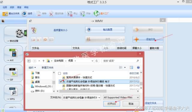 2、点击打开,再点击“添加文件”按钮图标,从电脑中打开需要转换的视频源文件(需要点击的图标都用红色箭头指示);
