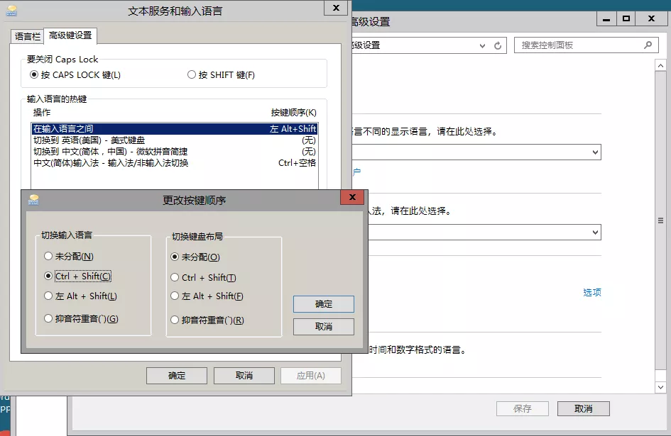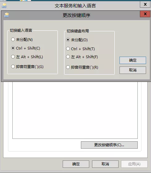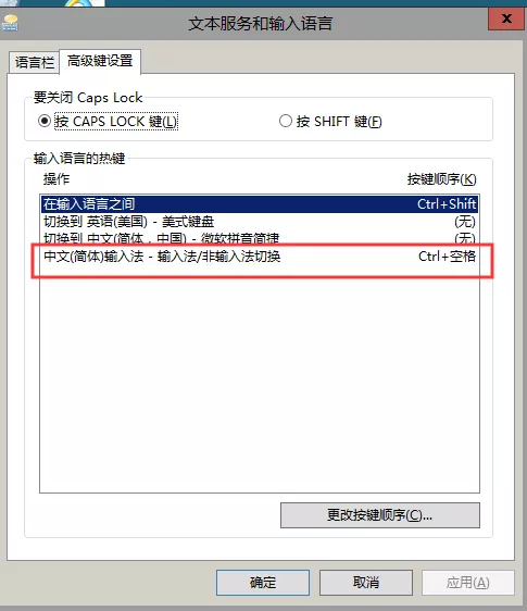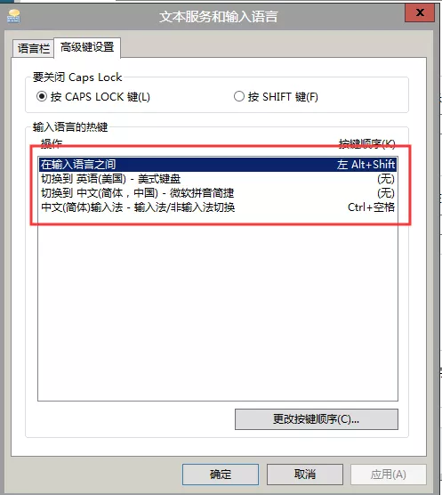 7、高级键设置,可以更改输入法语言之间切换的快捷键。