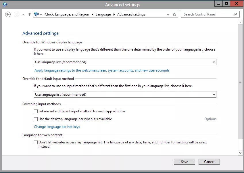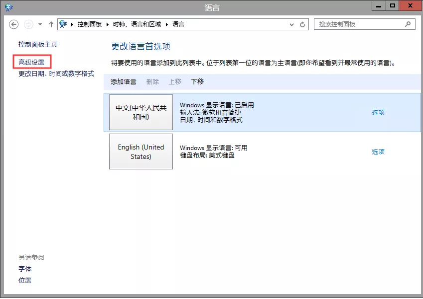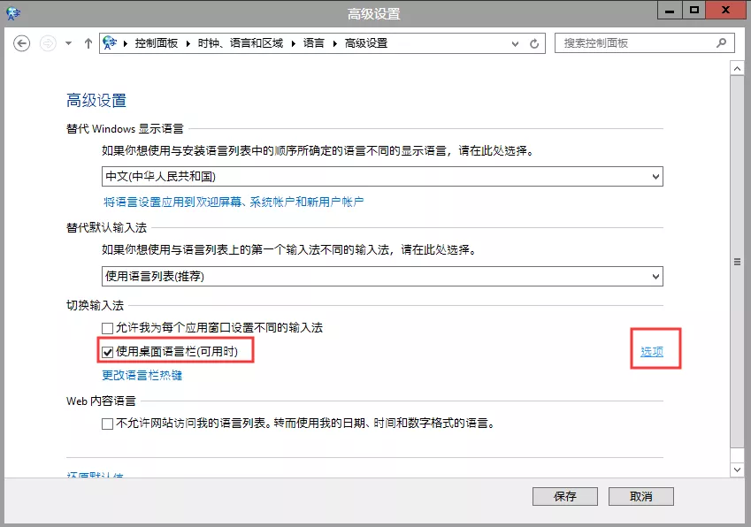 5、找到“控制面板”–“时间、语言和区域”—“语言”—“高级设置”,在切换输入法中,将“使用桌面语言栏(可用时)”前面打勾。打勾后,选择后面“选项”。