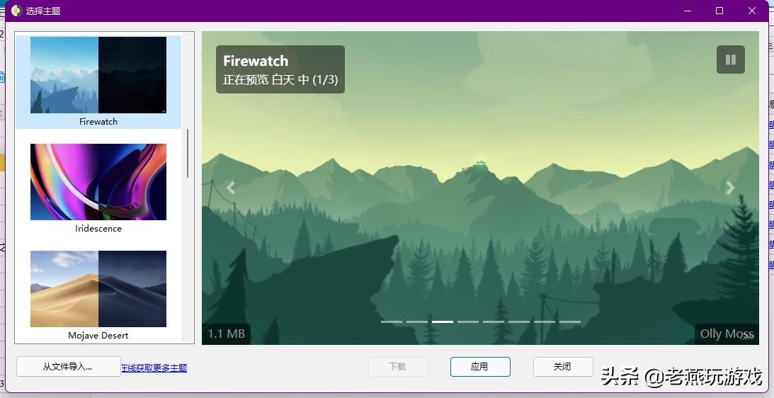 大部分都是免费的,当然也有收费的,但我相信免费的足够我们选择使用。下载完主题壁纸点击软件左下角的从文件导入…就可以了。