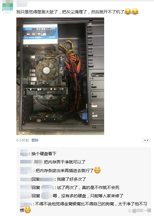 同事电脑弄好后,我想着我的主机也好几年没清灰了,便把我的主机外壳也拆开,然后把里面的灰清干净。结果悲剧了,我的电脑开不了机了。我便把自己的内存条也用橡皮擦也擦了几遍,重新开机,可是还是开不了。上午11点试到了下班点12点还没好。实在没有办法了,只能是请人来修了。但是修的人要下午才能来。