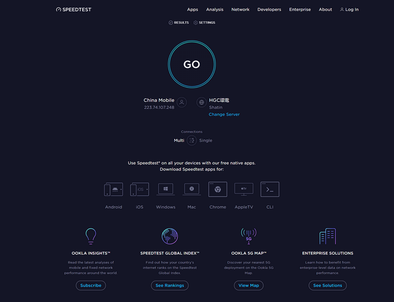 SPEEDTEST是一款国外开发的网络测速软件,支持平台有:Android(安卓手机)、iOS(苹果手机)、Windows(win7,win8,win10,win11)、Mac(苹果电脑,平板)、Chrome(Chrome 移动端系统)、AppleTV、CLI。支持在线测速和下载本地软件测速,该软件支持平台非常多,Linux只能在线测速。