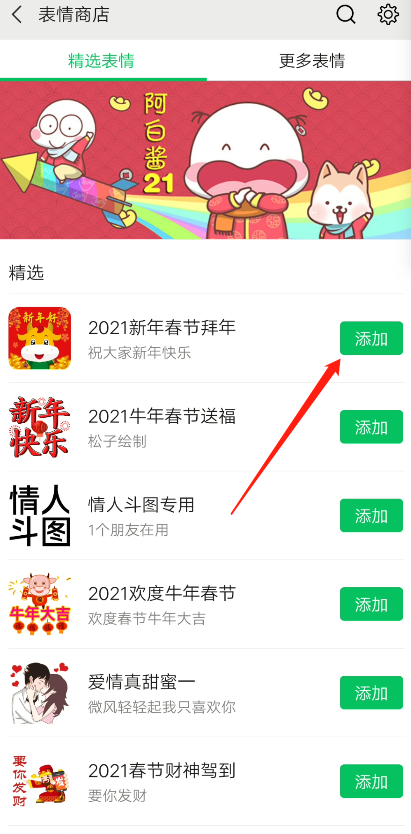 3、进去表情商店后,根据自己喜好选择表情包后,点击“添加”按钮。