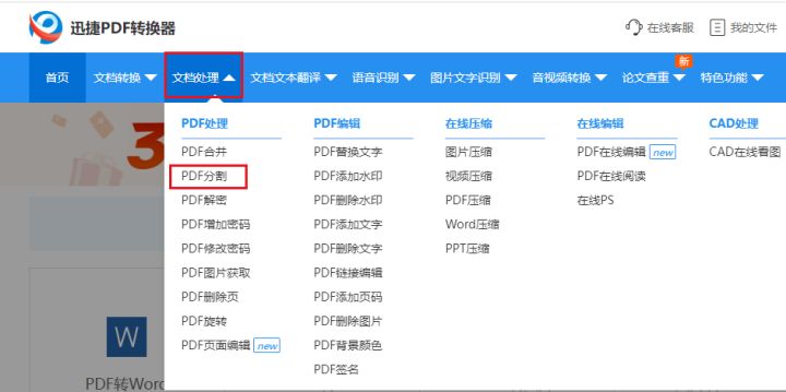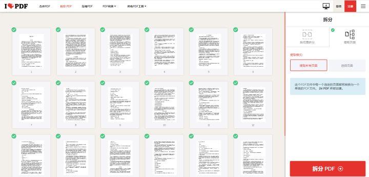 在文档处理选项中可以找到「PDF分割」功能,上传文件→在线分割→保存本地即可。