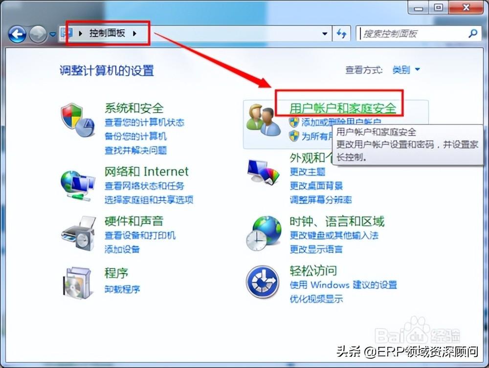 1. 打开“控制面板”,点击“用户账户和家庭安全”项进入