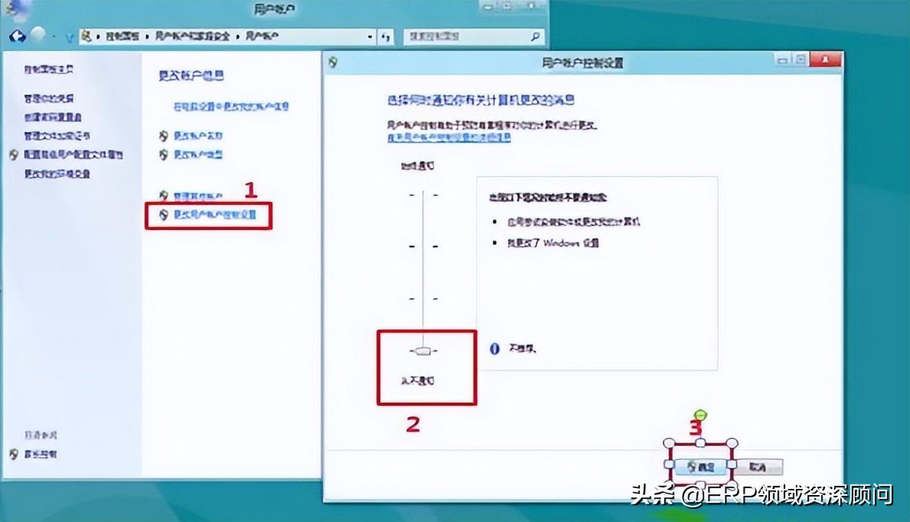 控制面板→用户帐户→用户账户→更改用户账户控制设置,把进度条拉到最低从不通知