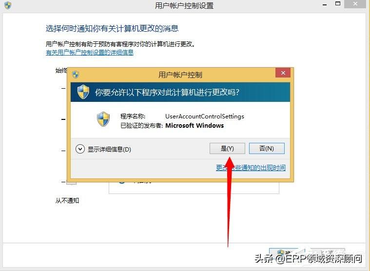 7、点击确定后,会出现:你要运行以下程序对此计算机运行更改吗?(表示之前已经开启UAC选项),点击“是(Y)”关闭用户账户控制(UAC)设置生效,如下图: