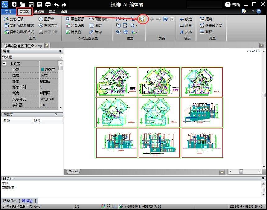 文件打开后就可以在软件中直接查看到该cad图纸的样子,滚动鼠标滚轮可以放大和缩小视图。可以在在查看选项卡中选择“平移”工具,可以拖动图纸。