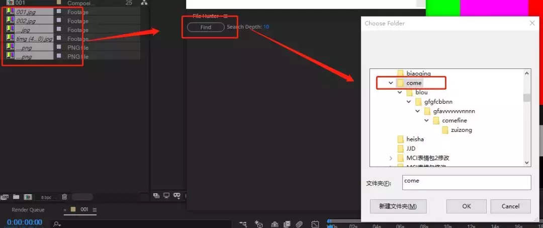全选丢失的素材,然后点击Find,选择最上层的文件夹名字(值得注意的是路径名称和素材名称记得是英文哟!)