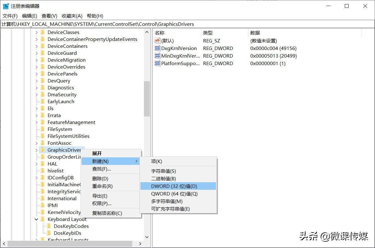 4.右键单击GraphicsDrivers键并选择新建>DWORD(32位)值或QWORD(64位)值,具体取决于你的系统架构。Windows 11只有64位。