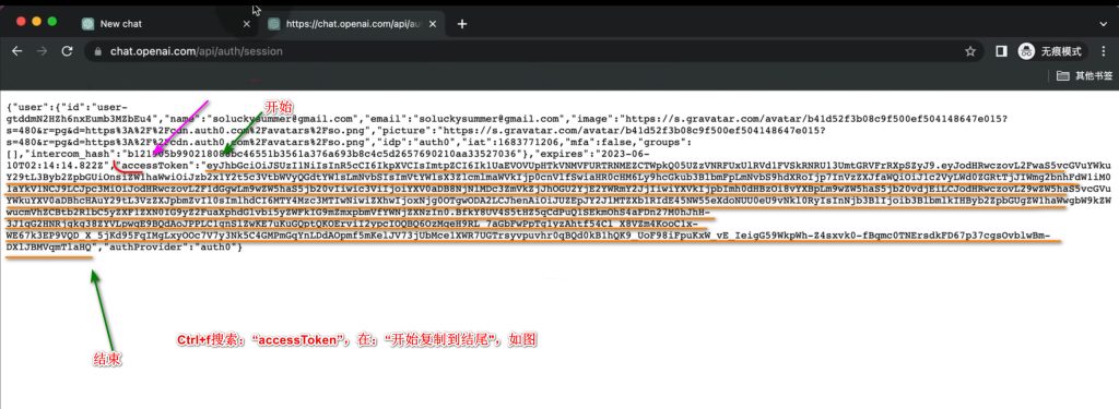 – 获取Token方法:获取Token需要”魔法上网“打开ChatGPT官方网站并登录,然后在浏览器”另打开一个窗口“输入这个网址:https://chat.openai.com/api/auth/session,然后会出现一个数据网页,从页面中用:”Ctrl+F“搜索”accessToken“,将accessToken值复制到Token输入框页面确定即可。