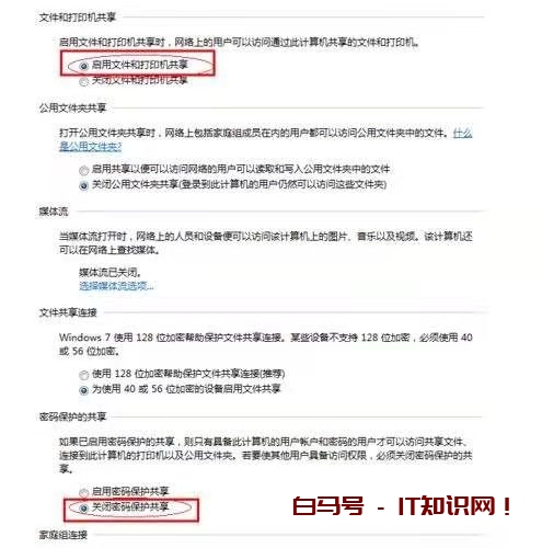 如果是家庭或工作网络,【更改高级共享设置】的具体设置可参考下图,其中的关键选项已经用红圈标示,设置完成后不要忘记保存修改。