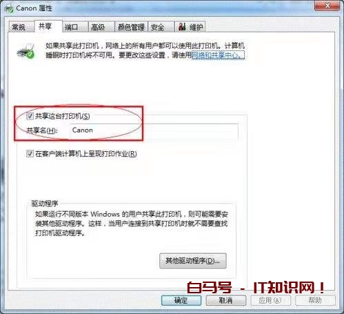 切换到【共享】选项卡,勾选【共享这台打印机】,并且设置一个共享名(请记住该共享名,后面的设置可能会用到),如下图: