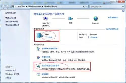 记住所处的网络类型,接着在弹出中窗口中单击【选择家庭组和共享选项】,如下图: