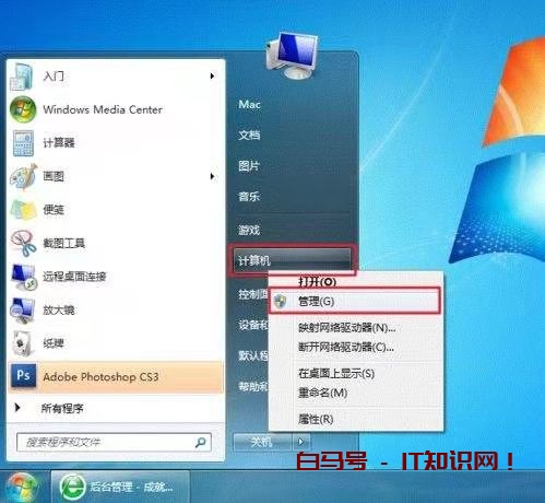 取消禁用Guest用户,因为别人要访问安装打印机的按个电脑就是以guest账户访问的。点击【开始】按钮,在【计算机】上右键,选择【管理】,如下图所示: