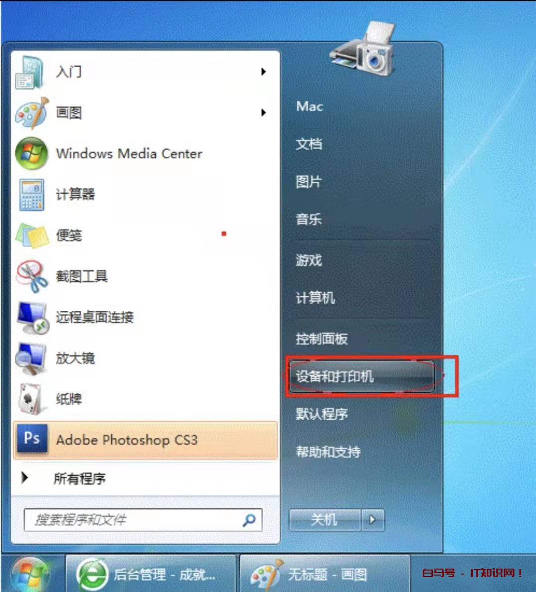 设置共享目标打印机:点击【开始】按钮,选择【设备和打印机】,如下图: