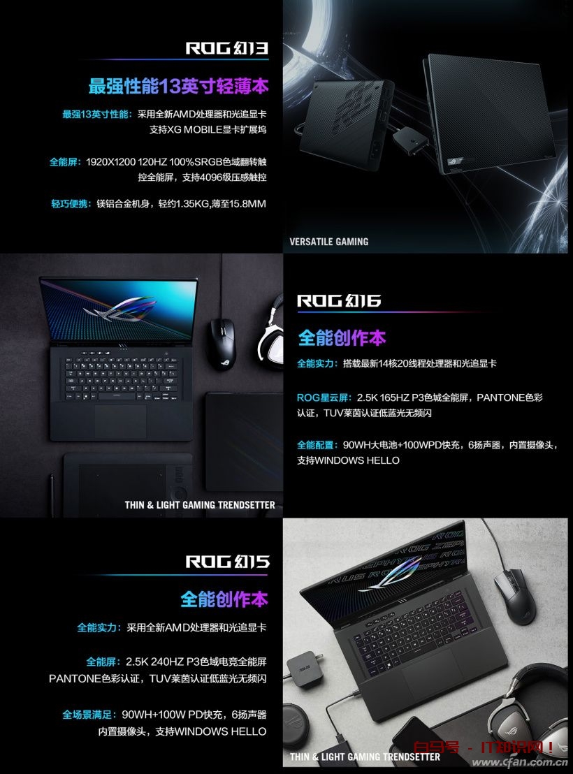 华硕ROG旗下的幻13/15/16都迎来了升级。其中,新款幻13搭载AMD锐龙6000H处理器,1920×1200像素120Hz刷新率的触控屏幕,支持XG Mobile显卡坞。幻15同样搭载锐龙6000H处理器,配备2.5K 240Hz P3色域屏幕。幻16则改用第12代酷睿H处理器,配备2.5K 165Hz屏幕,三款产品全部定位“全能创作本”。