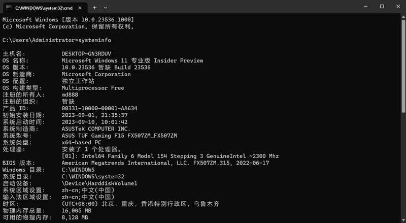 - 在命令提示符中,输入以下命令并按回车:systeminfo