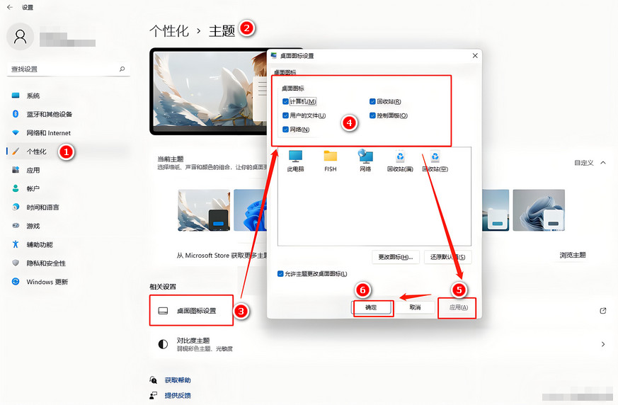 在打开的“设置”窗口中,点击左侧导航栏中的“主题”,然后在右侧找到并点击“桌面图标设置”。