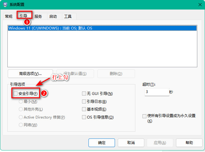 msconfig并回车。 - 在“系统配置”中选择“引导”标签,勾选“安全引导”选项,然后点击“应用”和“确定”。