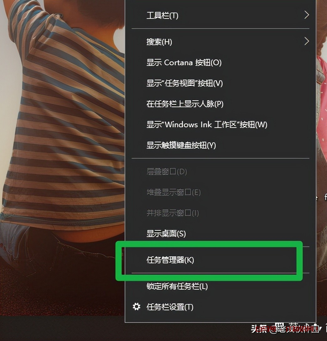 鼠标在任务栏空白处右击点击“任务管理器(K)”或者直接通过快捷键“ctrl+alt+.”启动任务管理器。
