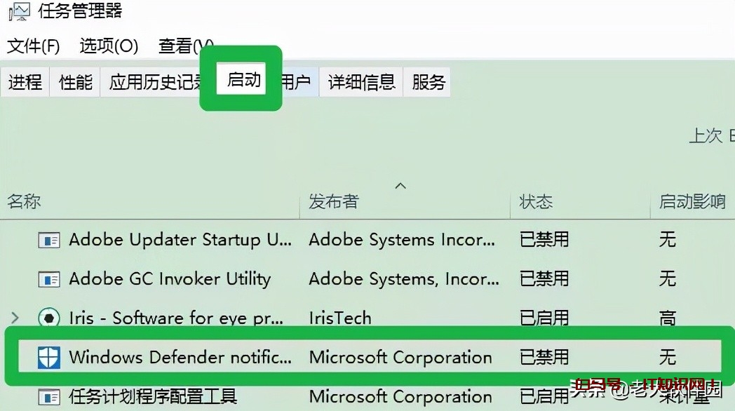点击“启动”,在启动的选项卡中,使用鼠标右键点击“Windows Defender notification icon”将其禁用,重启电脑即可。