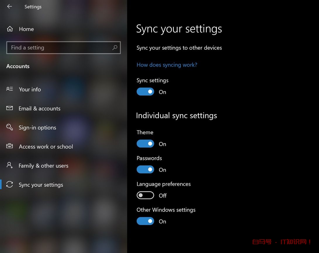 要关闭设置同步(包括主题和密码),请转到 设置 > 帐户 > 同步您的设置 。 您可以关闭所有设置同步,也可以有选择地关闭特定设置。