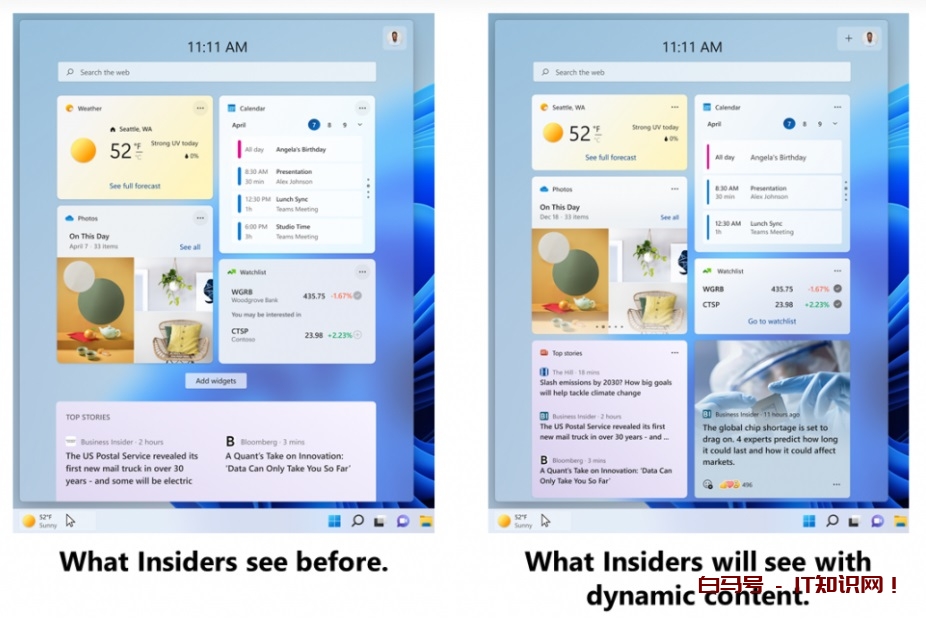 上面的屏幕截图将现有的小部件板与小部件动态提要进行了比较,这应该使用户更容易发现和参与新的小部件和新闻内容。