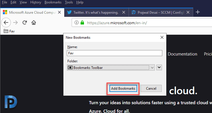 指定一个新的书签文件夹。 您还可以选择文件夹位置为 Bookmarks Toolbar 。 单击 添加 书签 。