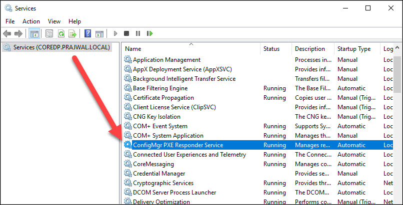 要验证 ConfigMgr PXE 响应程序服务状态,请在站点服务器上打开服务控制台。 然后将其连接到 Server Core DP。 找到 ConfigMgr PXE Responder Service 并检查它的状态。