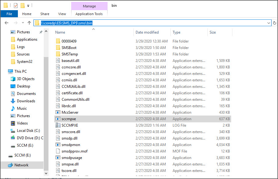如果您要查找引导映像和内容,它们位于 SCCMContentLib 文件夹中。 准确地说,SCCMPXE 可执行文件位于 SMS_DP$smsbin 文件夹路径中。 此外,可以在 SMSBoot 文件夹中找到启动映像。