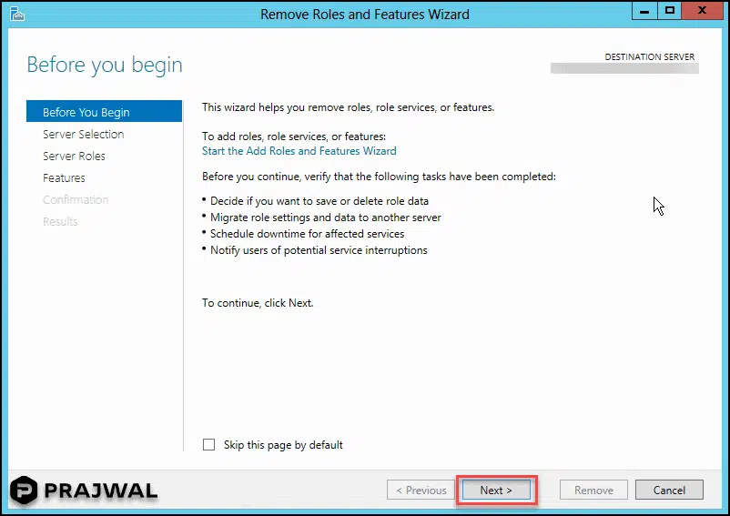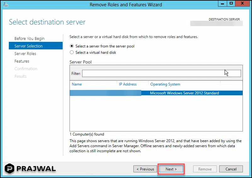 在此步骤中,您将验证要卸载 Windows 部署服务器角色的服务器名称。 单击 下一步 。