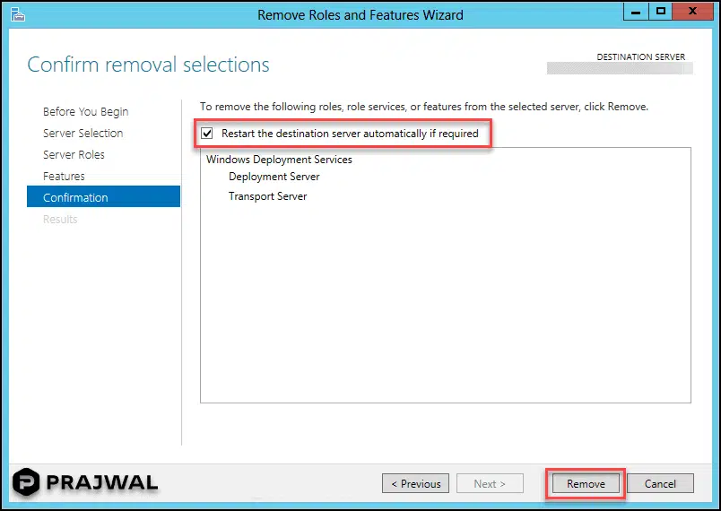 在“确认”页面上,选中“ 如果需要,自动重新启动目标服务器 。 卸载 WDS 后,如果服务器需要重新启动,您可以通过选中此框来确认服务器的自动重新启动。 如果需要,您可以跳过选中此框并稍后手动重新启动服务器。 单击 删除 。