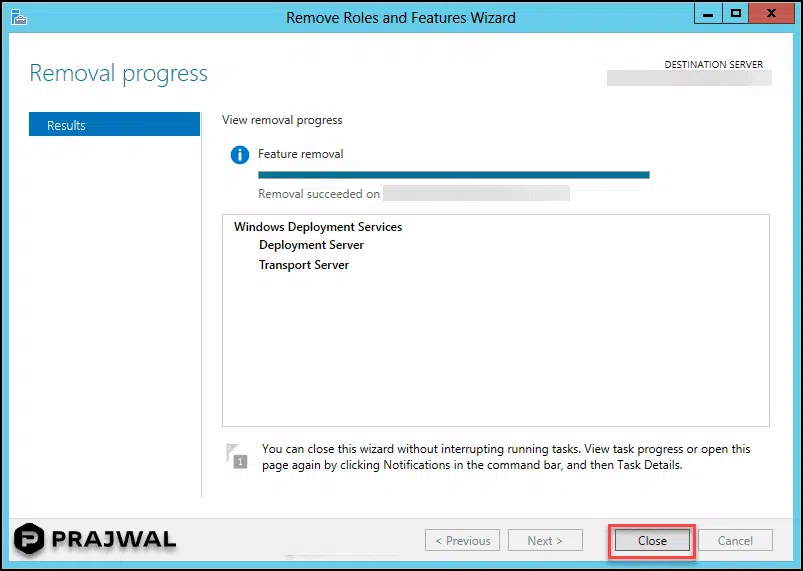 最后,您会注意到 Windows 部署服务角色已被卸载。 您看到的最后一个屏幕显示“计算机名称上的删除成功”。 单击关闭以关闭向导。 您可能希望重新启动服务器,因为您刚刚卸载了 WDS 角色。 希望本指南有所帮助。