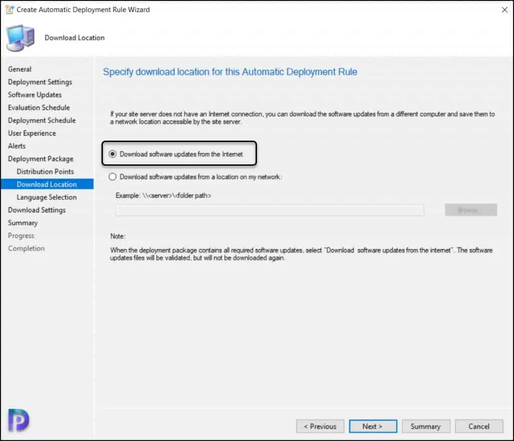 指定 ConfigMgr ADR 的下载位置。 选择 从 Internet 下载软件更新 。 单击 下一步 。