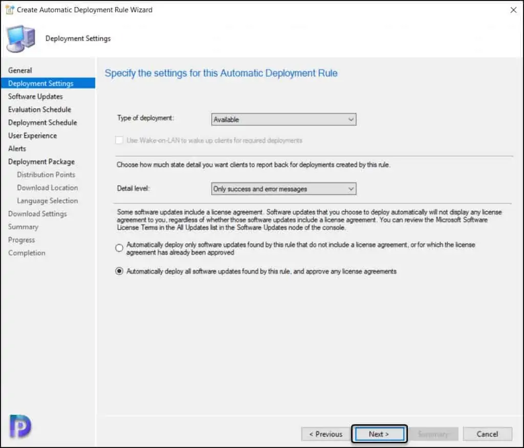 对于许可协议,选择 自动部署此规则找到的所有软件更新,并批准任何许可协议 。 单击 下一步 。