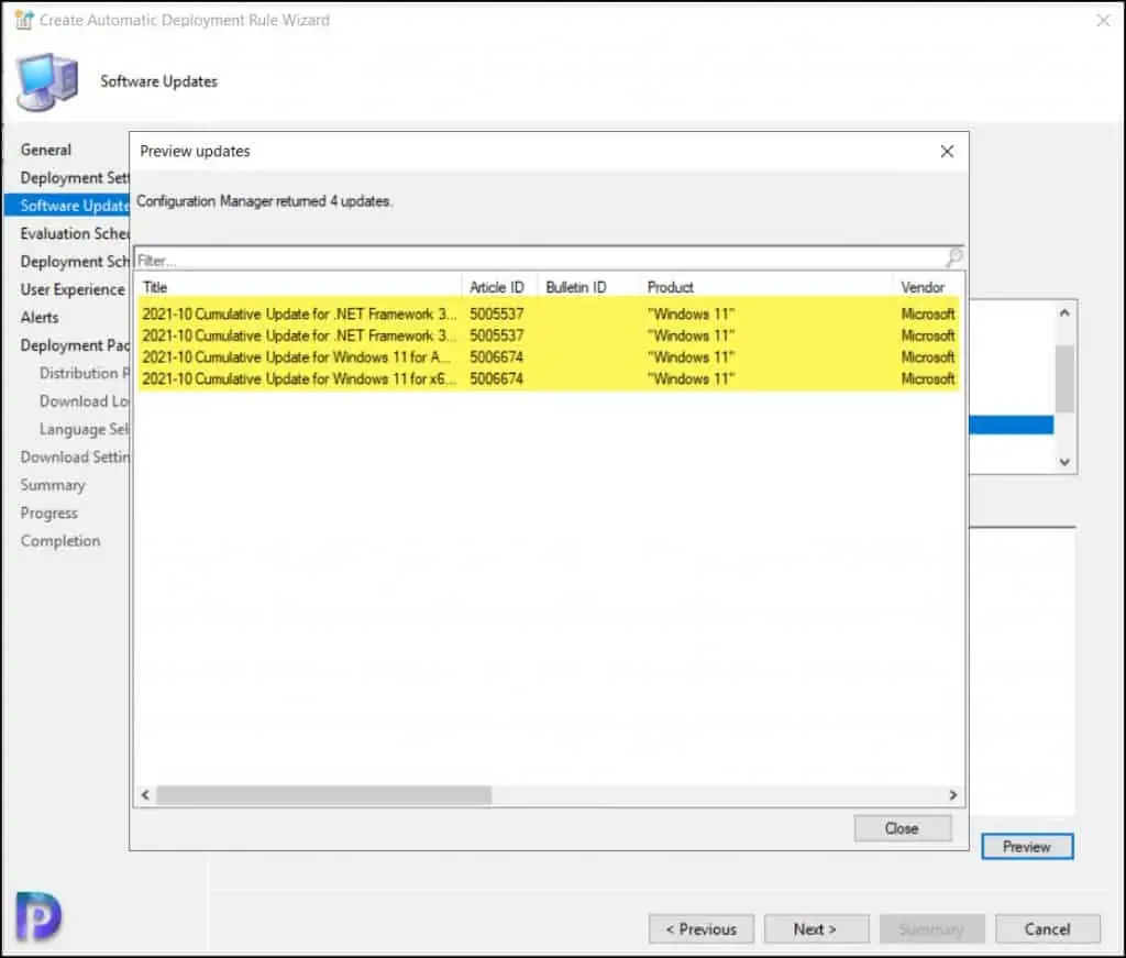 根据我们定义的搜索条件,预览更新窗口会显示适用的更新。 我们有 4 个可以部署的 Windows 11 更新。 单击 关闭 。