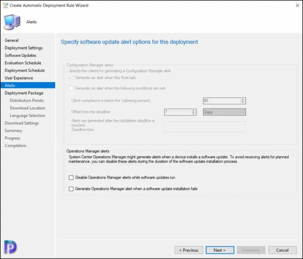 在“ 警报 窗口中,您可以为部署指定软件更新警报选项。 我不会在这里选择任何选项,单击 Next 。