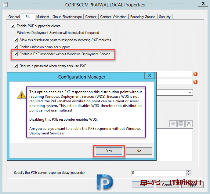 此新选项在分发点上启用 PXE 响应程序,这不需要 Windows 部署服务 (WDS)。 在确认框中,单击是以启用 ConfigMgr PXE 响应程序。