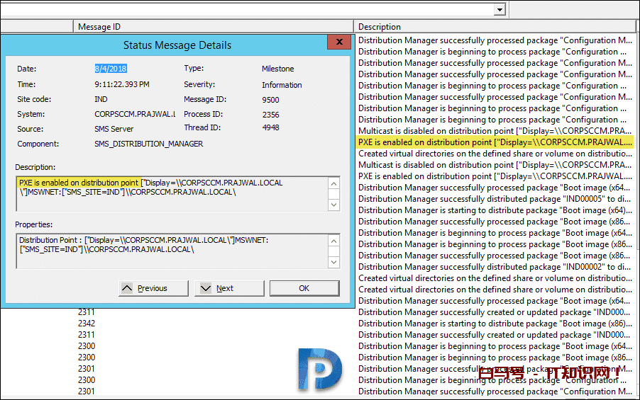 看一下 SMS_DISTRIBUTION_MANAGER 的状态消息细节,你会发现两件事。 首先,在分发点上启用了 PXE。