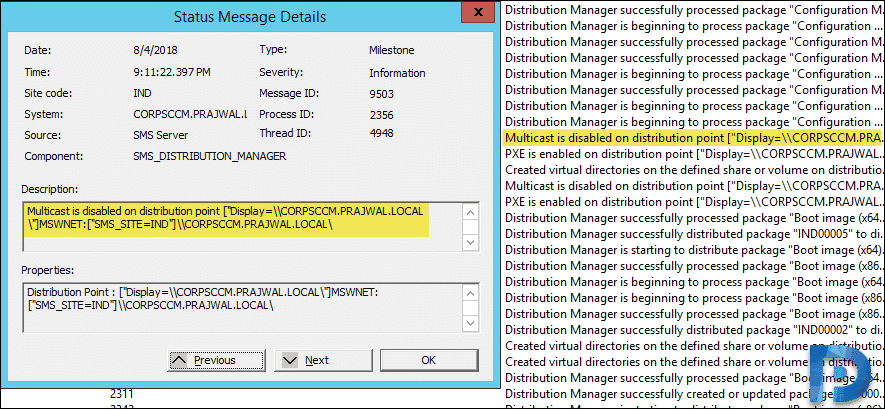 查看状态消息详细信息。 在 SCCM 分发点上,我们看到多播已禁用。