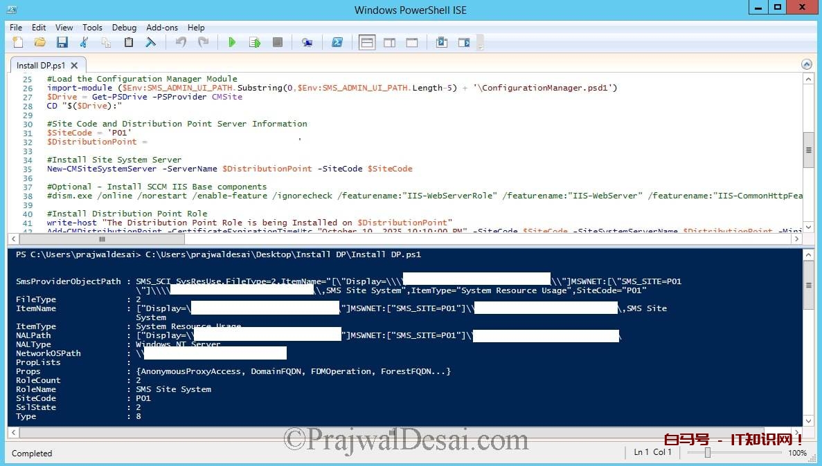 最后要运行此脚本,请启动 Windows PowerShell ISE。 单击文件 > 打开 > 浏览并找到脚本。 还要指定站点代码、DP、PXE 通行证,您就可以安装 DP。