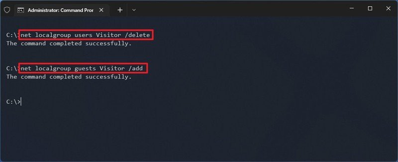 net localgroup users Visitor /delete - 键入以下命令将新用户帐户添加到“Guests”用户组,然后按 Enter :