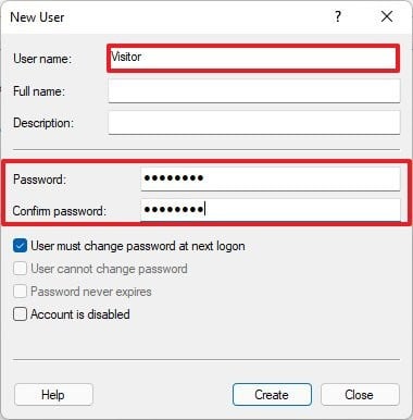 - 创建帐户名称(例如, 访问者 在“用户名”字段中