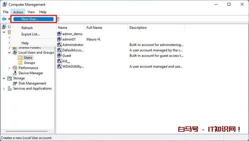 System Tools > Local Users and Groups > Users - 单击“操作”菜单并选择“ 新用户 选项。