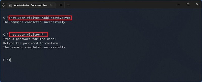 net user Visitor /add /active:yes - 键入以下命令为帐户设置密码,然后按 Enter :
