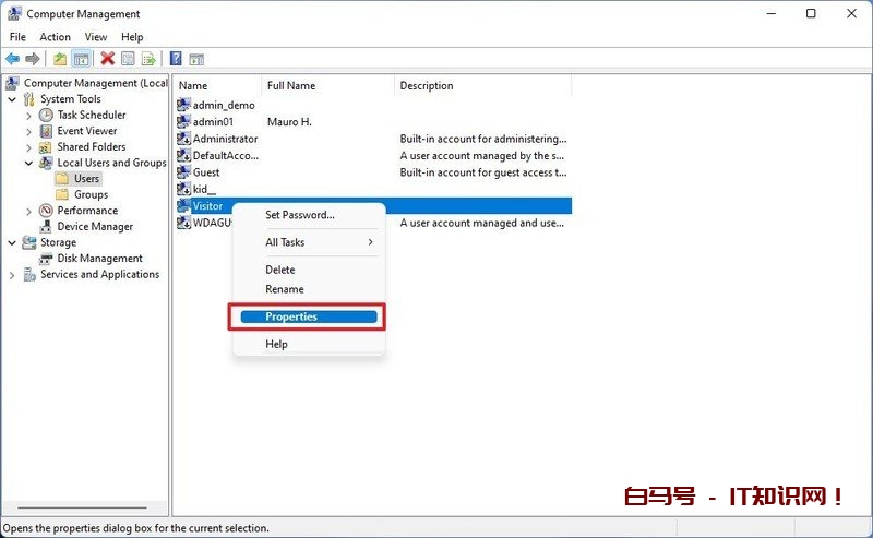 System Tools > Local Users and Groups > Users - 右键单击该帐户并选择“ 属性 选项。