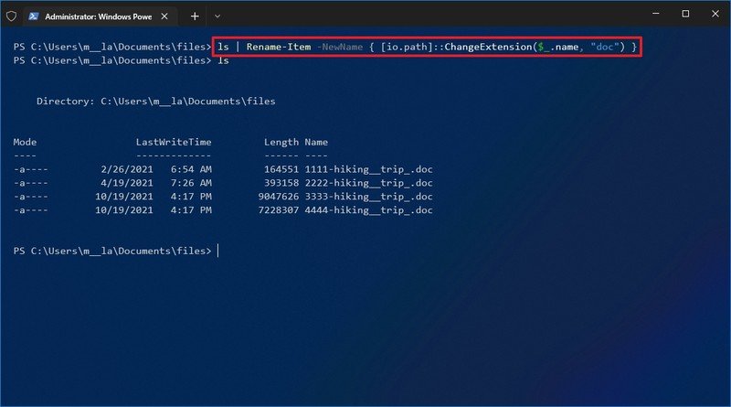 完成这些步骤后,PowerShell 将使用命令中指定的特定扩展名重命名文件。