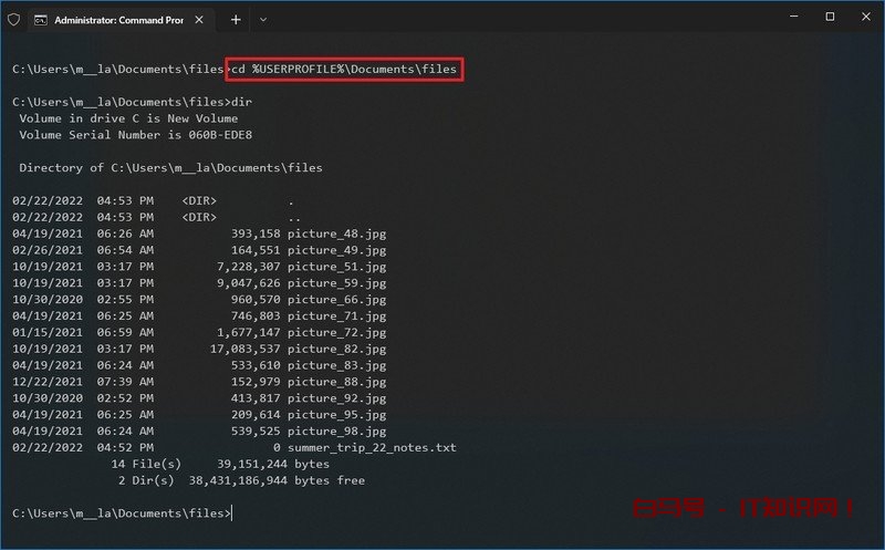 cd C:UsersUSERNAMEDocumentsfiles - (可选)键入以下命令以查看该位置中的文件列表,然后按 Enter :